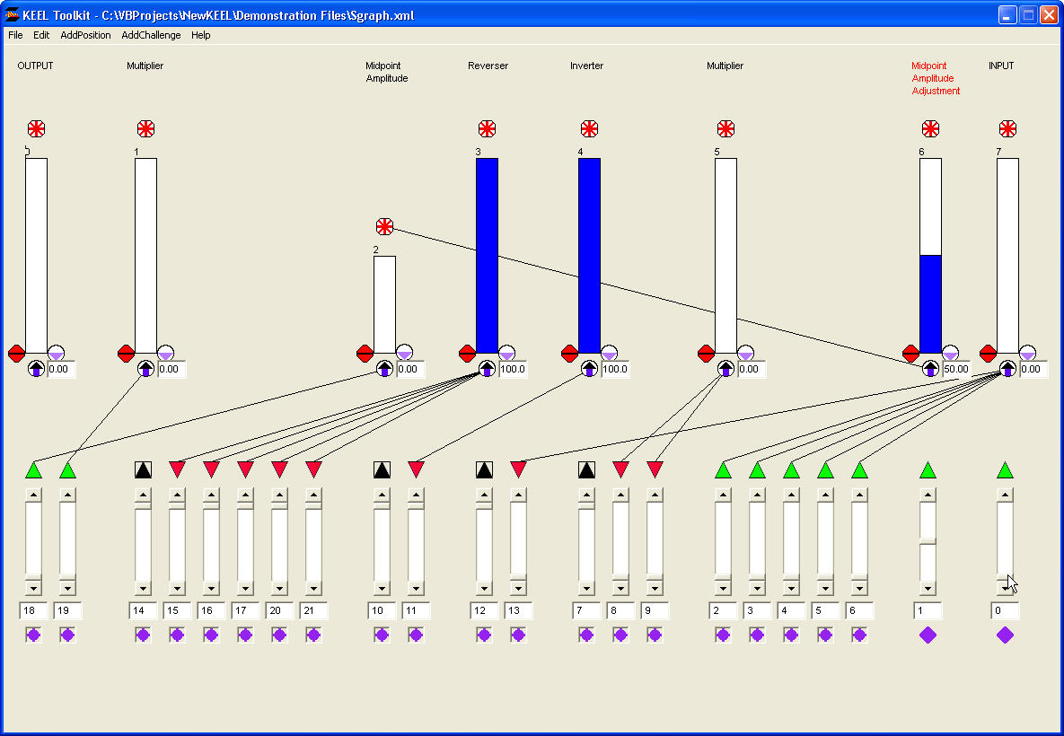 This is an accumulation of two curves: a convex curve whose slope goes from vertical to horizontal and is limited to a value defined by the "Midpoint Amplitude Adjustment" and a second curve whose slope goes from horizontal to vertical across the entire range of the "INPUT" modified value. With the "Midpoint Amplitude Adjustment" position set at 50%, the curve is symetrical as shown in the first graph.