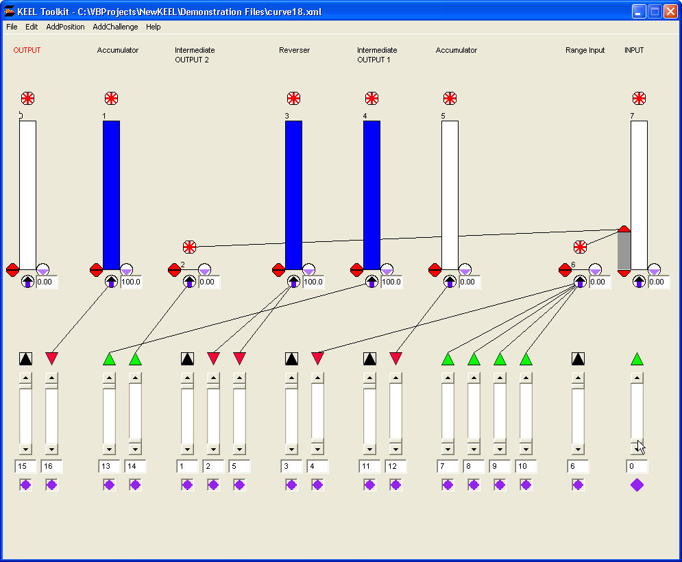 This is an inverted version of Curve 17. It is restricted to a limited range. In this case, we are using the clipper window of the "INPUT" position to drive the "Range Input" and the "Intermediate OUTPUT 2" importance. The "Intermediate OUTPUT 1" and "Intermediate OUTPUT 2" are combined in the "Accumulator" position and inverted in the "OUTPUT" position (which takes the form of a "reverser").